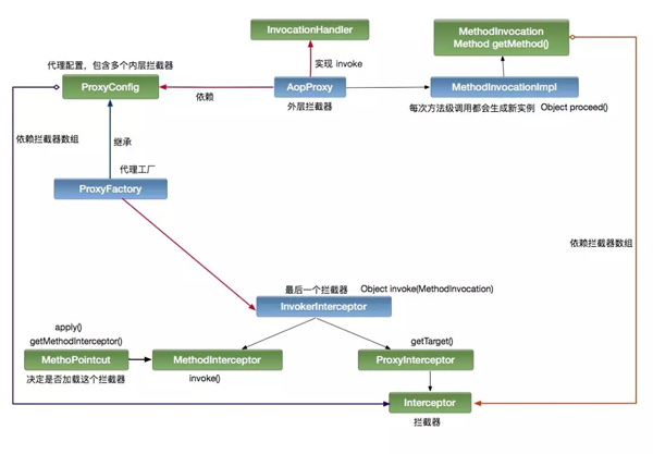 注意:创建代理对象时,同时会创建一个外层拦截器,这个拦截器就是 Spring 内核的拦截器。用于控制整个 AOP 的流程。