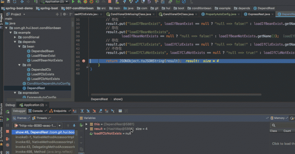 * 当系统中没有 com.git.hui.boot.conditionbean.example.depends.clz.DependedClz类时,才会创建这个bean