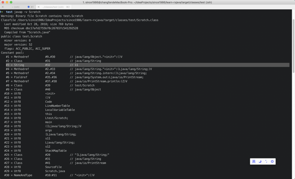 大家看问题中的 String s12 = "11"; 这一段代码,这是一个很简单的字面量声明,经过「后端圈」群里兰大的指导,同时加上我自己的验证,我了解到,这个字符串字面量的声明会在编以后存储到 class 文件中的 class文件常量池 中。关于这一点可以用 javap -v 来印证: