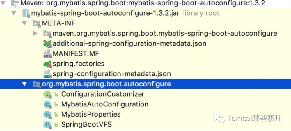 相比传统的依赖,我们看到其中包含这样一个: mybatis-spring-boot-autoconfigure ,这也是每个Starter的秘密所在:「AutoConfigure」