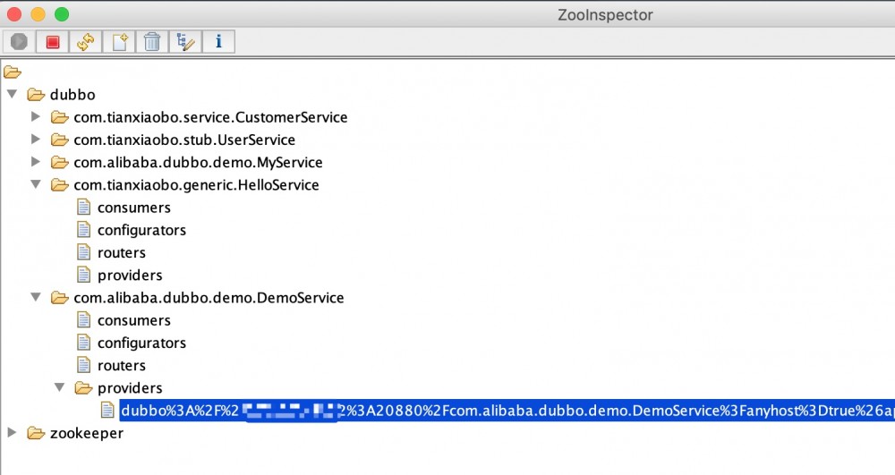 以 Zookeeper 为例,所谓的服务注册,本质上是将服务配置数据写入到 Zookeeper 的某个路径的节点下。为了验证这个说法,下面我们将 Dobbo 官方提供提供的实例跑起来,然后通过 Zookeeper 可视化客户端 ZooInspector 查看节点数据。如下:
