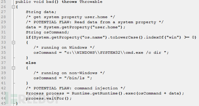 示例源于 Samate Juliet Test Suite for Java v1.3 ( https://samate.nist.gov/SARD/testsuite.php ),源文件名:CWE78OSCommandInjectionProperty01.java。