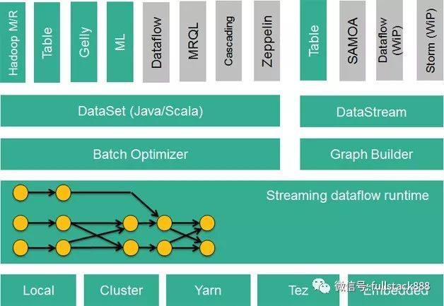 Flink核心是一个流式的数据流执行引擎,其针对数据流的分布式计算提供了数据分布、数据通信以及容错机制等功能。基于流执行引擎,Flink提供了诸多更高抽象层的API以便用户编写分布式任务:
