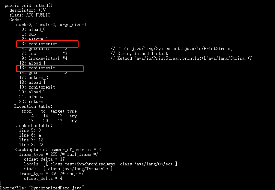 通过 JDK 自带的 javap 命令查看 SynchronizedDemo 类的相关字节码信息:首先切换到类的对应目录执行 javac SynchronizedDemo.java 命令生成编译后的 .class 文件,然后执行 javap -c -s -v -l SynchronizedDemo.class 。