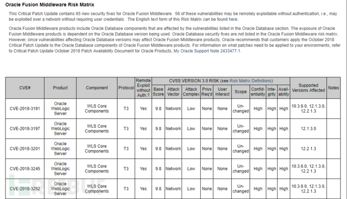 在不久前Oracle官方发布的10月重要补丁更新公告(Oracle Critical Patch Update Advisory – October 2018)中发布了五个基于T3协议的WebLogic远程高危漏洞(CVE-2018-3191、CVE-2018-3197、CVE-2018-3201、CVE-2018-3245、CVE-2018-3252),CVSS 3.0 Base Score均为9.8分,版本涉及:10.3.6.0, 12.1.3.0, 12.2.1.3,本文将针对其中影响较大的CVE-2018-3191进行复现与分析,并在流量端进行追溯。