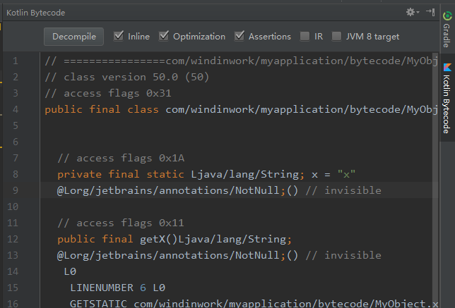 private final static Ljava/lang/String; x = "x" public final getX()Ljava/lang/String; ... public final setX(Ljava/lang/String;)V .. public final foo()Ljava/lang/String; ... public final static Lcom/tanzhouedu/testapplication/MyObject; INSTANCE 复制代码