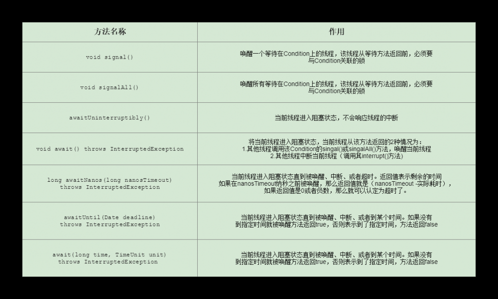 在正式介绍Condtion之前,我们可以先了解其中声明的方法。具体方法声明,如下表所示: