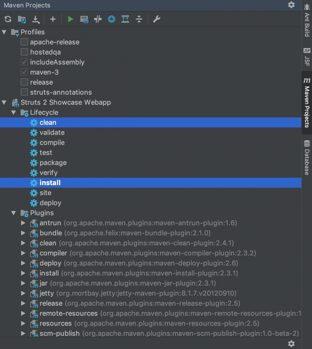 Struts2的showcase是一个可以用Maven编译和运行的项目。我在使用IDEA编译的时候使用了Maven生命周期的两个命令: clean 和 install 。
