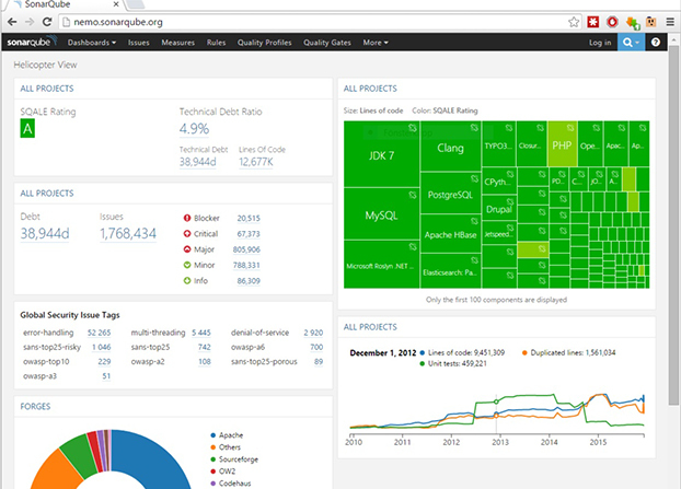 SonarQube 为组织提供了一个集中的位置来管理和跟踪多个项目代码中的问题。它还可以把持续的检查与质量门限相结合。一旦项目分析过一次以后,更进一步的分析会参考软件最新的修改来更新原始的统计信息,以反映最新的变化。这些跟踪可以让用户看到问题解决的程度和速度。这与 “尽早发布并经常发布”不谋而合。