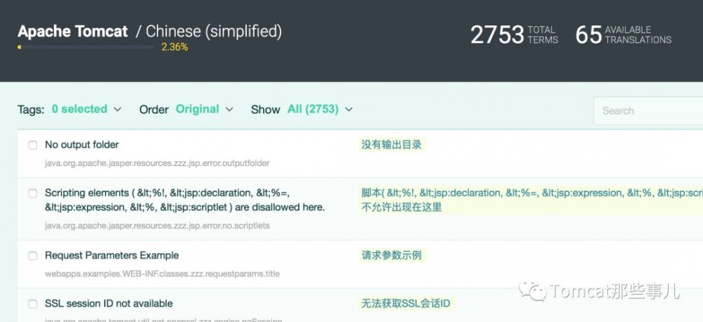 看到这个邮件的时候,心想做为一个写 Tomcat 的公众号,是不是可以贡献些自己的力量,就去注册了一下,进去打算看了下中文翻译的进度。结果发现还没中文,干脆直接新增了,同时顺手翻译了一些条目。