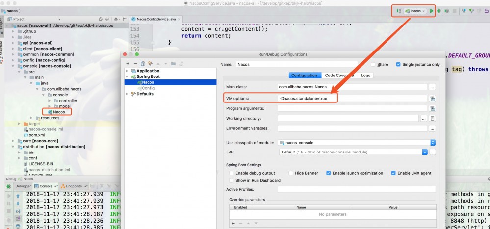 访问 https://github.com/alibaba/nacos ,使用Git克隆Nacos代码,直接导入到IDEA中,如下所示设置启动参数,直接启动。