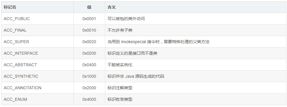 访问标志信息包括该class文件是类还是接口,是否定义成public,是否是abstract,如果是类,是否被申明为final。access_flags 的取值范围和相应含义见下表。