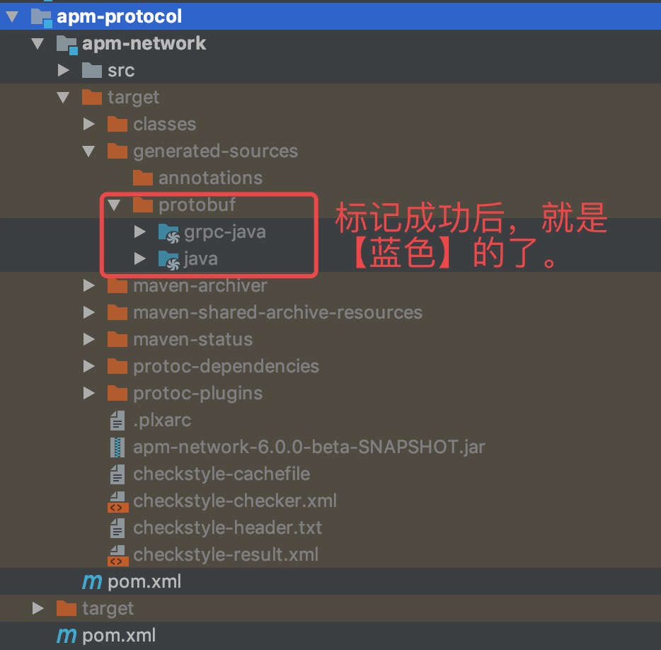 apm-protocol/apm-network/target/generated-sources/protobuf 目录下面 grpc-java 和 java 目录 右键 设置为 Generated Rources Root 。