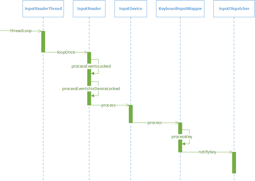 InputReader是在InputReaderThread中启动的,InputReaderThread和InputDispatcherThread的定义是类似的,也是继承了Thread并定义了threadLoop纯虚函数。如果处理的事件为键盘输入事件,则调用时序图如下所示。
