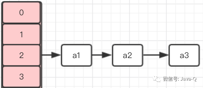 假设一个HashMap的初始容量是4,使用默认负载因子0.75,有三个元素通过Hash算法计算出的数组下标都是2,但是key值都不同,分别是a1、a2、a3,HashMap内部存储如下图: