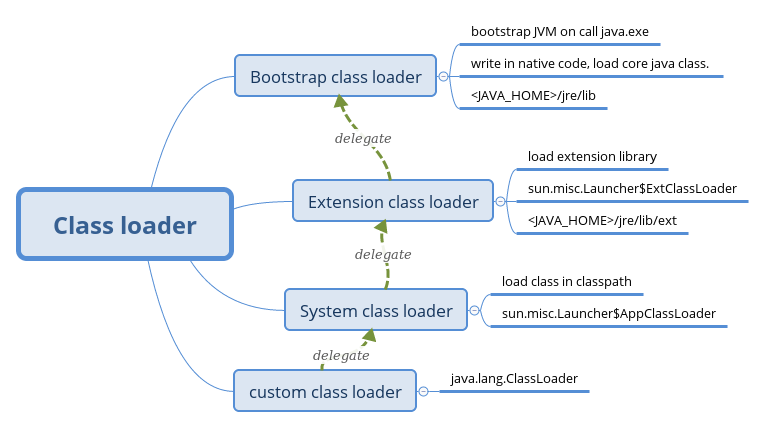 Bootstrap ClassLoader 启动类加载器 :每次执行 java 命令时都会使用该加载器为虚拟机加载核心类。该加载器是由 native code 实现,而不是 Java 代码,加载类的路径为 <JAVA_HOME>/jre/lib 。特别的 <JAVA_HOME>/jre/lib/rt.jar 中包含了 sun.misc.Launcher 类, 而 sun.misc.Launcher$ExtClassLoader 和 sun.misc.Launcher$AppClassLoader 都是 sun.misc.Launcher 的内部类,所以拓展类加载器和系统类加载器都是由启动类加载器加载的。 Extension ClassLoader , 拓展类加载器 :用于加载拓展库中的类。拓展库路径为 <JAVA_HOME>/jre/lib/ext/ 。实现类为 sun.misc.Launcher$ExtClassLoader System ClassLoader 系统类加载器: 用于加载 CLASSPATH 中的类。实现类为 sun.misc.Launcher$AppClassLoader Custom ClassLoader , 一般都是 java.lang.ClassLoder 的子类 正统的类加载机制是基于双亲委派的,也就是当调用类加载器加载类时,首先将加载任务委派给双亲,若双亲无法加载成功时,自己才进行类加载。