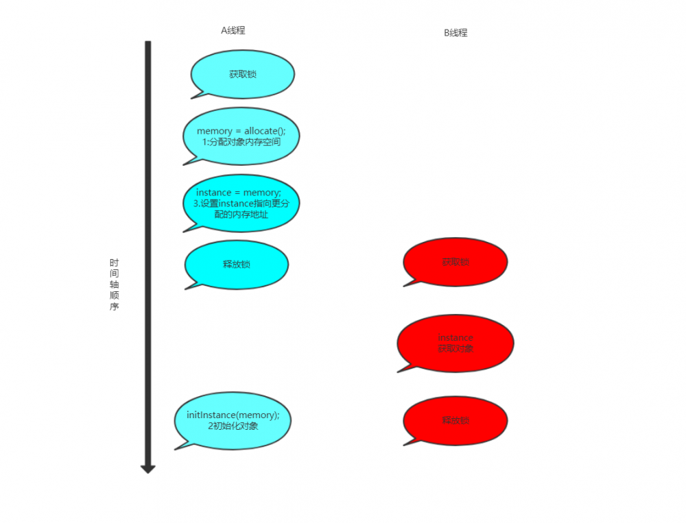 memory = allocate(); //1分配对象内存空间 initInstance(memory);//2初始化对象 instance = memory; //3设置instance指向更分配的内存地址 复制代码
