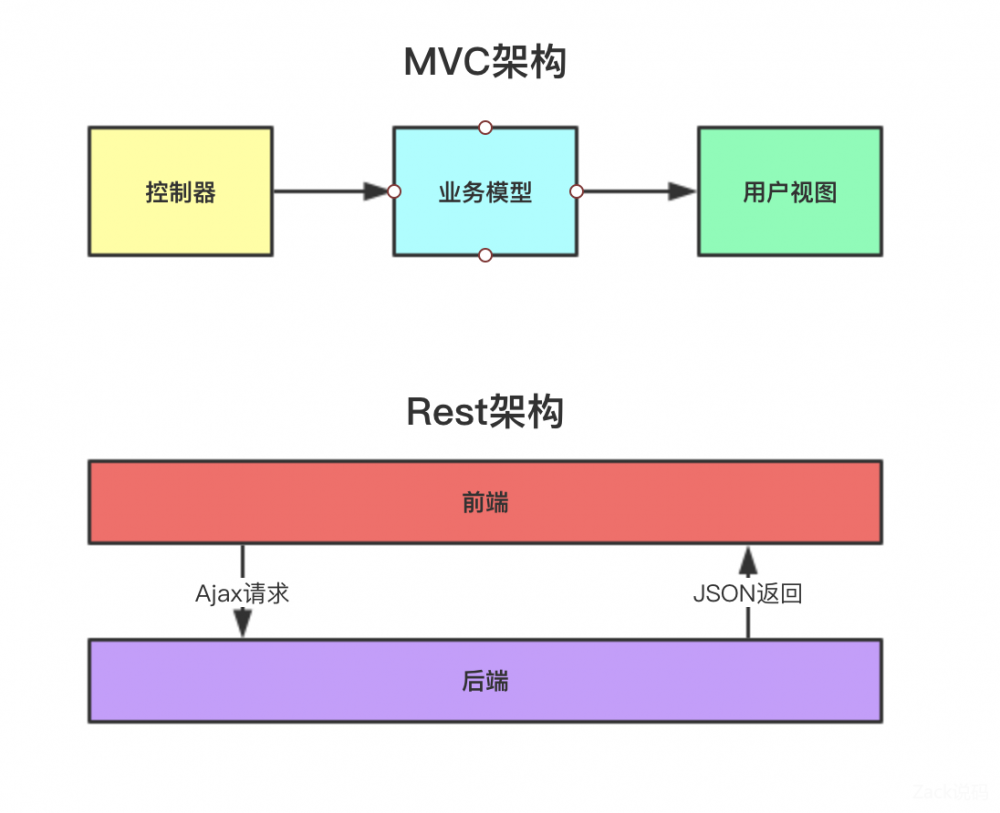 不过自从15年开始,随着各种前端框架的崛起,使得前端后端的关系发生进一步的演变,从MVC架构演变成前后端分离的REST架构了。以前MVC架构每次请求都需要经过控制器->模型->视图的流程,演变成前端请求后端接口,返回JSON的这样一种REST架构。