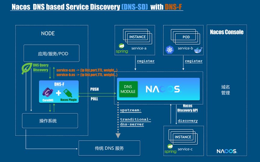 到目前为止,市面上的服务发现的解决方案有很多,仅在JavaSpring生态中,就有Zookeeper,Consul,Eureka,Nacos等解决方案,更不用说在其它的语言和框架中,Nacos通过提供DNS-F,可以让用户更容易地实现以DNS协议为基础的服务发现(DNS-SD),而DNS协议是一个成熟的标准协议,可以有效的帮助用户消除耦合到厂商私有服务发现API上的风险。