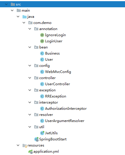 大家以前都使用过session存储信息,有的交给容器创建,有的存储到mysql或者redis,这次项目用到了JWT,我们把用户的信息和登录的过期时间都封装到一个token字符串里,客户端每次请求只需要在头信息里携带token即可,话不多说,下面是目录结构.