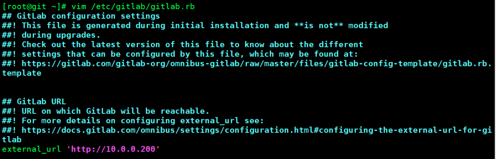 [root@git ~]# vim /etc/gitlab/gitlab.rb 更改url地址为本机IP地址 external_url 'http://10.0.0.200'