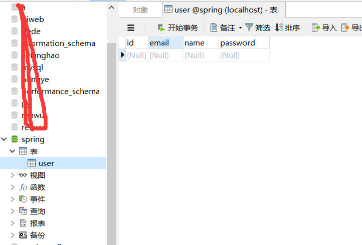 首先创建我们的数据库(这里我使用的是Mysql),为了演示方便,我这里简单的创建一个spring数据库,然后数据库有一个user用户表:
