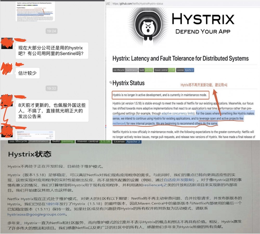 至于Hystrix,Netflix在2018年11月19号左右,Netflix的开源项目Hystrix宣布状态,不再开发新功能,处于维护状态,其实在之前Spring Cloud官方就在孵化spring-cloud-r4j.