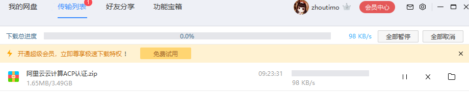 用过百度网盘的朋友都知道,当非会员需要使用的时候,下载一个文件,你会发现下载速度很慢,速度被限制到几十k/s,这个时候你会看到上方有一个免费试用超级会员急速下载的按钮,试了一下10M/s 左右,确实快多了,但是一看会员价格有点小贵,偶尔下个东西就买一年的超级会员又不划算。那么怎么才能摆脱限速呢?