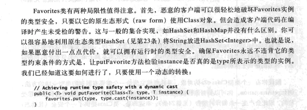 Bloch指出这种模式有两个局限性 。“首先,恶意的客户端可以通过以原生态形式(raw form)使用class对象轻松地破坏类型安全。”为了确保在运行时类型安全可以在Context#put中使用动态转换(dynamic cast)。