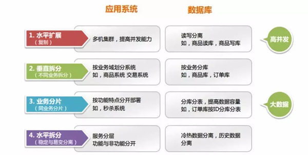 从采用的先后顺序可分为:水平扩展、垂直拆分、业务拆分、水平拆分;