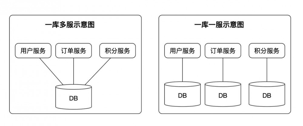 而共享数据最贱的方式就是采用共享数据库模式,也就是单体应用中最常用的方式,一般只有一个数据库,如图一库多服和一库一服的方式: