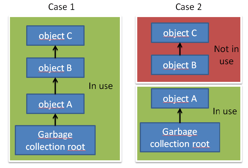 当你创建一个对象时,JVM会在 堆内存 中为其分配空间。堆内存的空间是有限的,因此JVM通常需要删除一些对象来释放空间。如果要销毁一个对象,JVM需要先知道这个对象是否有效。如果一个对象被一个 垃圾回收根节点 (传递式)引用,那么该对象仍然有效。