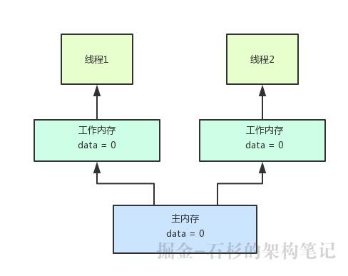 好了,现在大家从图里看到,每个线程都把data这个变量的副本加载到了自己的工作内存里了,所以每个线程都可以读到data = 0这个值。
