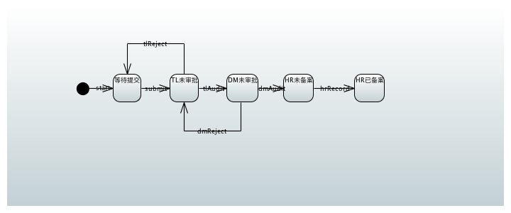 可以看到,通过 UML 方式绘制状态机,减少了在代码中定义 Event、State 和 Transition 的过程,但 UML 中必须通过额外的元素(Signal和 Signal Event)来定义事件,在目前来说 Spring StateMachine 只支持 Papyrus 绘制的 UML 图。