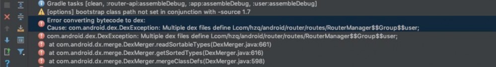 我们知道Router的映射表有两张表,第一张是用来存储分组和分组对应的class的,第二张是用来存储每个分组中具体url映射关系的。而在第一个问题中我们根据moduleName来避免存放分组的class重名的问题。那么每个分组class本身有没有重名的可能呢?答案是一定有的。比如:我们在user组件中配置的url:/user/main分组为user,这个时候在编译user组件时就会自动生成一个类名为 RouterManager$$Group$$user 的类,用来存放所有的以user为分组的页面映射关系。那么当我们在app的中也配置分组名为user的分组后,编译app时就会在app中生成类名为 RouterManager$$Group$$user 的类。而我们app项目是依赖的user组件的,这就导致有两个类名一样的文件。编译时自然就会报错。