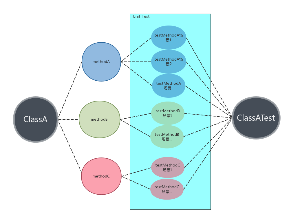 举个例子,我们有ClassA,在ClassA中有三个方法,分别是methodA, methodB, methodC。那我们的测试方案就是针对ClassA创建一个ClassATest类,并在类中针对每个方法的多个场景进行测试,并且尽量考虑正常情况和异常情况,包括各种临界值的场景。如下图。