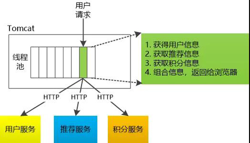 比如说调用“推荐服务”的时候,就会从“推荐服务线程池” (假设有5个线程)中找到一个线程执行。如果这个HTTP系统调用迟迟没有返回,那这个线程就会一直等待,新的请求就需用使用池中别的线程。