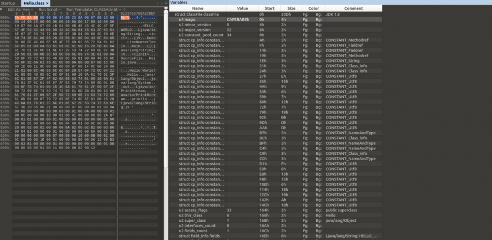 javac 命令编译生成 Hello.class 文件。这里推荐一个利器 010Editor ,查看分析各种二进制文件结构十分方便,相比 Winhex 或者 Ghex 更加智能。下面是通过 010Editor 打开 Hello.class 文件的截图: