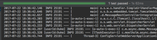 注意到倒数第二行和第三行:在这个log级别上输出了[userId:Duke],倒数第三行是在一个web线程里(一个使用@RestController注解的类)发出的,倒数第二行是在一个用了@Async注解的异步线程里发出的。本质上,MDC数据从web线程中复制到了使用@Async注解的异步线程里中了(这就是最酷的部分,:smirk:)