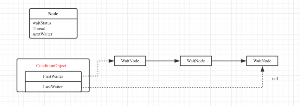 正如图所示,Node节点的数据结构,在等待队列中使用的变量与同步队列是不同的,Condtion中等待队列的结点只有直接指向的后继结点并没有指明前驱结点,而且使用的变量是nextWaiter而不是next,这点我们在前面分析结点Node的数据结构时讲过。firstWaiter指向条件队列的头结点,lastWaiter指向条件队列的尾结点,等待队列中结点的状态只有两种即CANCELLED和CONDITION,前者表示线程已结束需要从等待队列中移除,后者表示条件结点等待被唤醒。