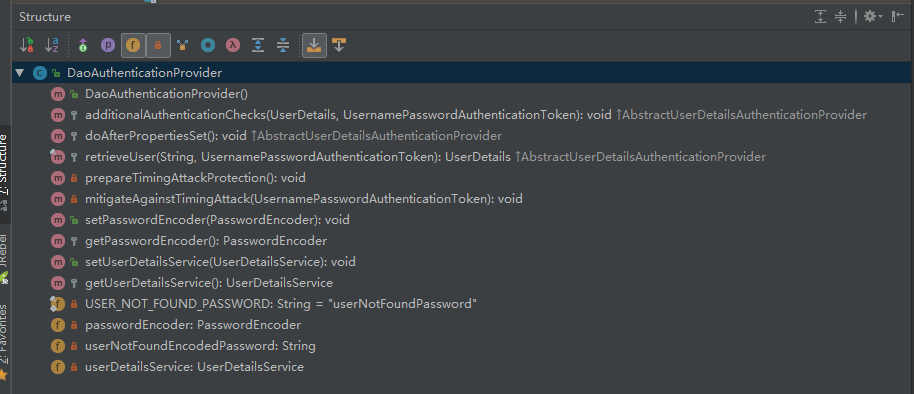 AuthenticationProvider最最最常用的一个实现便是DaoAuthenticationProvider。顾名思义,Dao正是数据访问层的缩写,也暗示了这个身份认证器的实现思路。由于本文是一个Overview,姑且只给出其结构图: