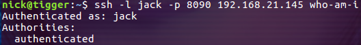 $ ssh -l jack -p 8090 192.168.21.145 who-am-i