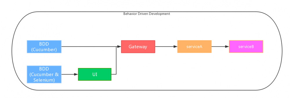 举个例子,我们有三个微服务,一个是Gateway, 一个是ServiceA, 一个是ServiceB,它们的调用关系如下图。 现在三个微服务都已经上线了,我们要对整体的微服务进行测试,可以创建一个BDD项目,专门进行BDD测试。如果前面还有UI组件,我们也可以通过Selenium脚本在BDD项目中针对UI进行测试。