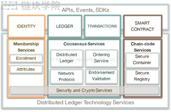 如上图所示,Fabric架构的核心包括三部分:Identity, Ledger及Transactions, Smart Contact.