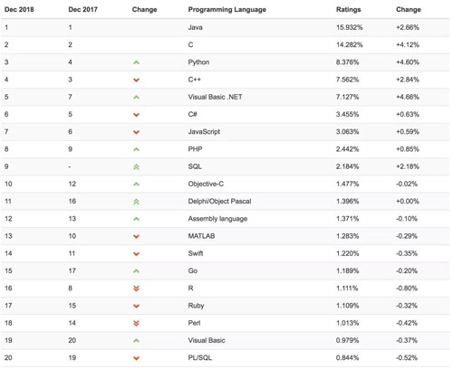 2018年12月的TIOBE编程语言排行榜已经出炉,Python重回前三,Go语言跌出前十,Visual Basic.NET涨幅明显,保持第五名。
