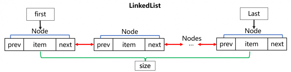 LinkedList 对数据进行封装,在内部组装成 Node。LinkedList 由下面几个部分组成,主体为若干个 Node,首尾各一个 Node 的引用,一个记录 Node 个数的 size。前后的 Node 之间互相引用,构成双向链表。如果链表为空,first 和 last 都指向 null,如果链表中只有一个 Node,first 和 last 都指向这个 Node(first 和 last 都是这个 Node 的引用)。如果链表有多个 Node,first 和 last 分别指向链表首尾的 Node。对于每个 Node 来说,如果该 Node 前还有 Node,那么这个 Node 的 prev 指向前一个 Node,否则 prev 指向 null;如果该 Node 后还有 Node,那么这个 Node 的 next 指向后一个 Node,否则 next 指向 null。