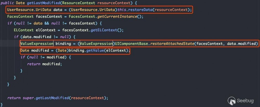 官方给的描述是通过 UserResource 类进行EL表达式注入的,全局搜一下 UserResource 这个类,定位到 org.ajax4jsf.resource.UserResource 。同样官方说可以用 UriData 进行反序列化利用链的构造,简单看了一下,需要注意的以下三个方法: