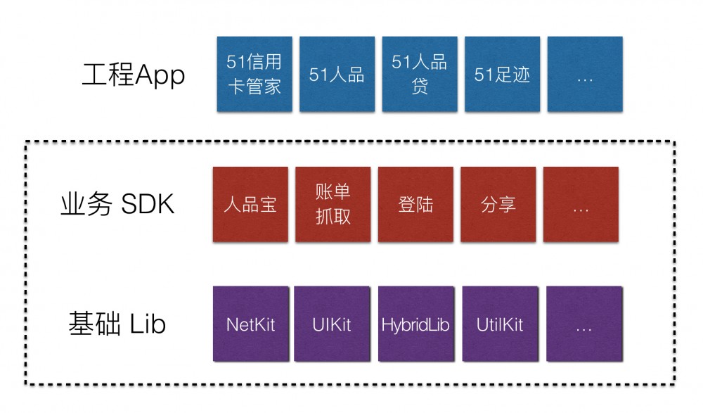 随着业务的快速扩张,原本小作坊式的单个工程的开发模式越来与不能满足实际需求。早在两年多以前,51 信用卡管家就向下沉淀出了单独的公用基础库,一些通用的功能组件和个别独立的业务被拆分成 SDK,形成了一套中型项目、多人并行的开发模式,也为未来组件化拆分做准备。