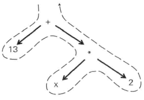 该节点含有两个子节点,对应节点对象的eval方法将被依次调用。左侧left()对应的子节点的eval方法将返回13,右侧right()对应的子节点的eval方法将返回x*2的计算结果。将两侧eval方法的返回值相加,就能得到+运算符的计算结果。该结果将成为+节点的eval方法的返回值