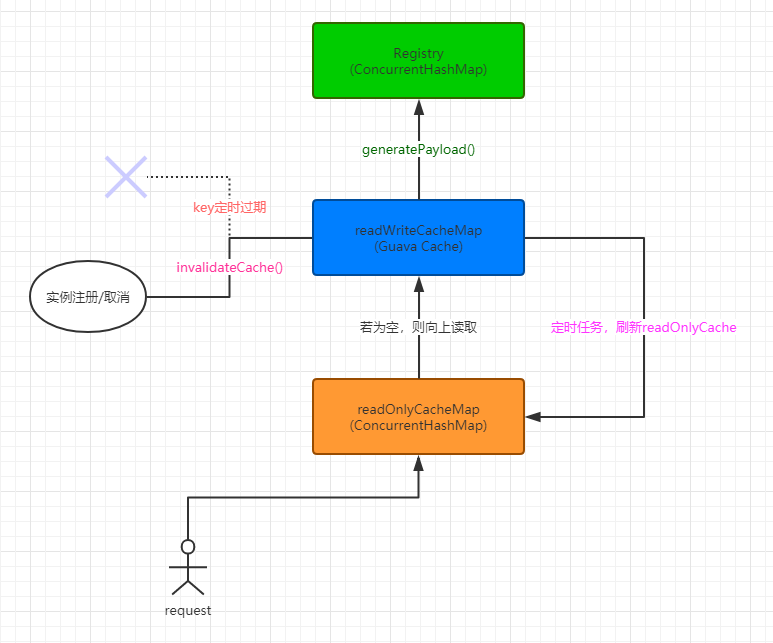 服务端的注册信息读取使用缓存,而非直接读取registry那个 ConcurrentHashMap 。缓存的主要逻辑都在 ResponseCacheImpl 这个类中。